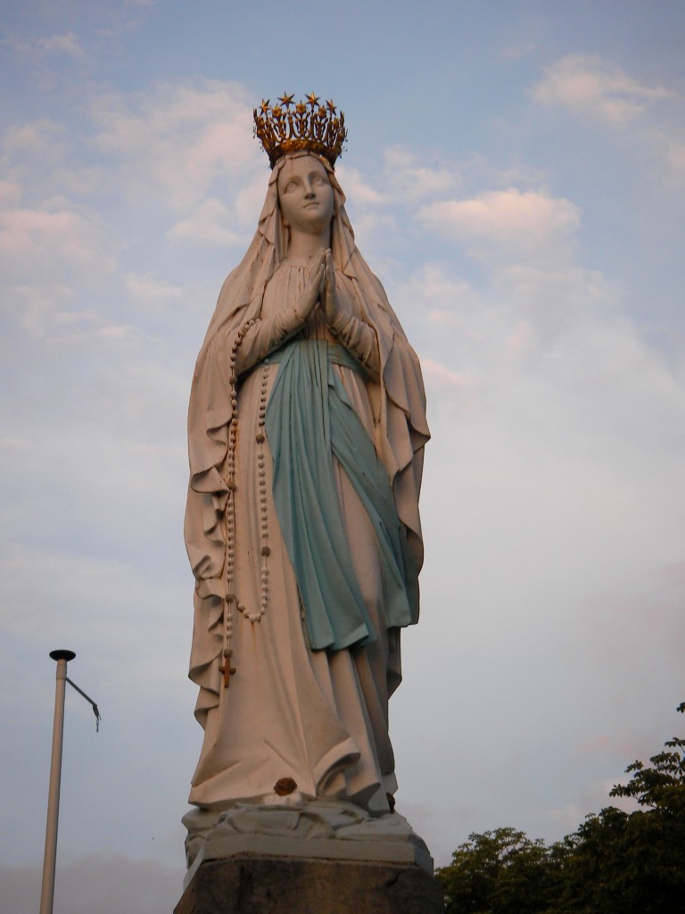 その言葉を聞いたとき、ベルナデッタに現れた貴婦人は聖母マリアであるということが証明されたのでした。白い衣に青い帯を締めた姿で現れた美しい姿が、ルルドの中央にご像として立っています