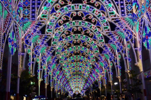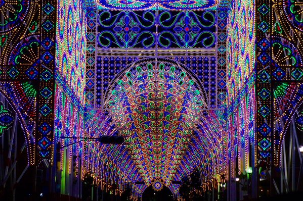 複数基のアーチを並べることで正面から見ると光のトンネルに見えるように設計されおり、アーチが繋がって見えるように電飾の間隔が計算されているのです。