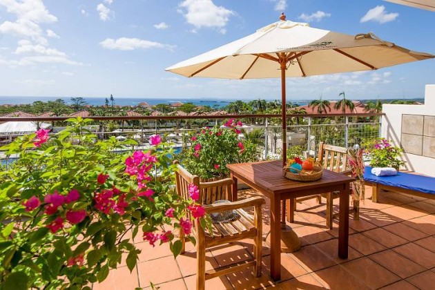ノースウィングのスタンダートルームのバルコニー。ガーデンデッキチェアも置かれパラソルを開く事も出来ます。