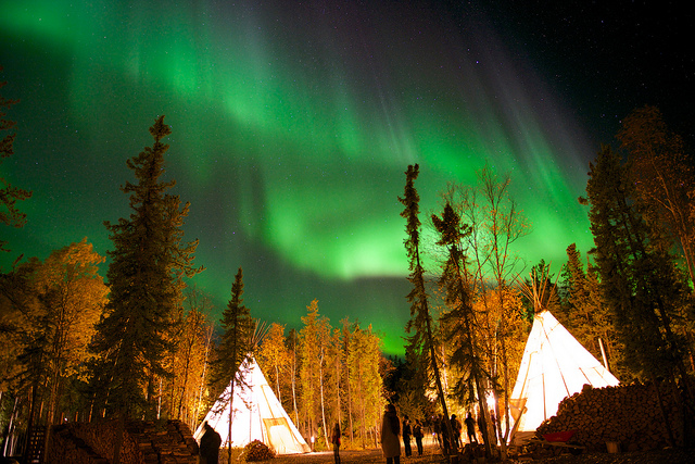 ティーピーと呼ばれる先住民独特のテント、樹々、そしてオーロラが織り成す景色は本当に美しいです。