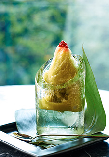 こちらのカクテルは、バンブーリータ。氷で作られた竹型のグラスが京都の冷涼な夏を表現しており、カクテル「バンブー」を軸に、シェリー、そしてベルモットの上に和三盆と梅酒を加えた、口当たりのいい上品な甘さです。フローズンで召し上がるので暑い日におすすめ。