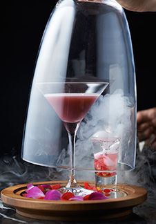 こちらのカクテルは、ローザロマ。ローズのリキュールを使い、花のエッセンスを取り入れたシグネチャーカクテルで、ローズシロップとベルローズの入った小さなグラスにお湯を注ぐことで、ドライアイスのミストが発生し、目の前でグロッシュを開けるとローズのアロマが漂います。