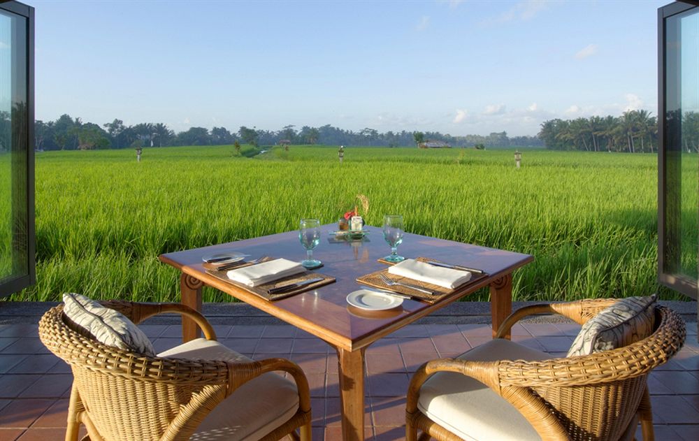 オープンエアのレストラン「The Restaurant」では、どのテーブルからも、タナ・ガジャの緑がまぶしい広大な水田と熱帯地方独特の木々をご覧になりながら、お食事をしていただけます。